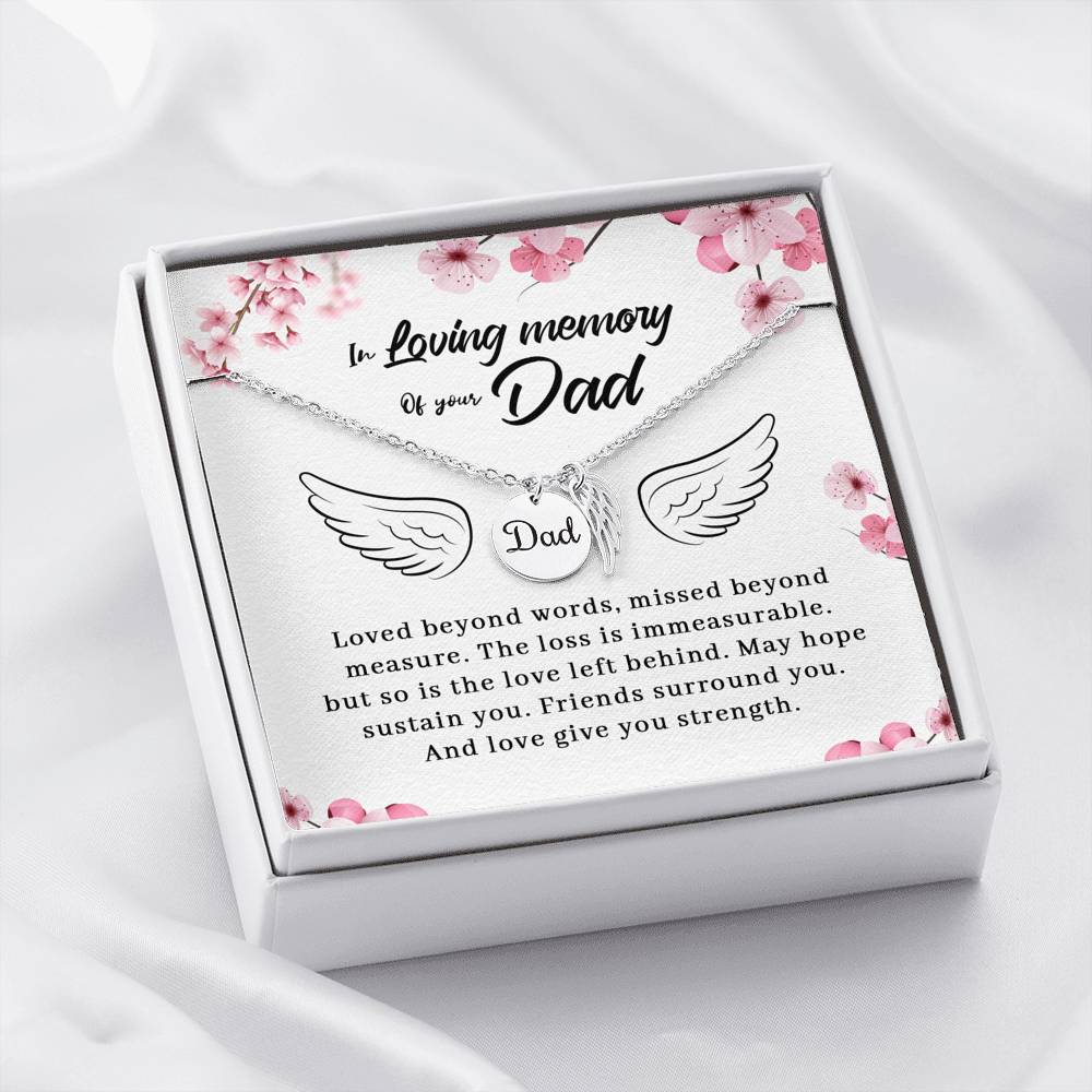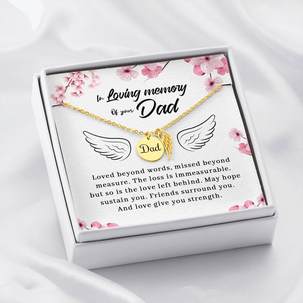 Keep Dad close to your heart with this loving Remembrance Necklace. "Dad" is engraved on the dainty hand polished coin and enhanced in black enamel, paired with a delicate polished Angel Wing tag on an adjustable cable chain measuring 18"-22" with a lobster clasp closure. Available in Polished Stainless Steel and 18k Yellow Gold over Stainless Steel. Pendant Dimensions: Circle: 0.5" (13mm), Wing: 0.625" (10mm)
