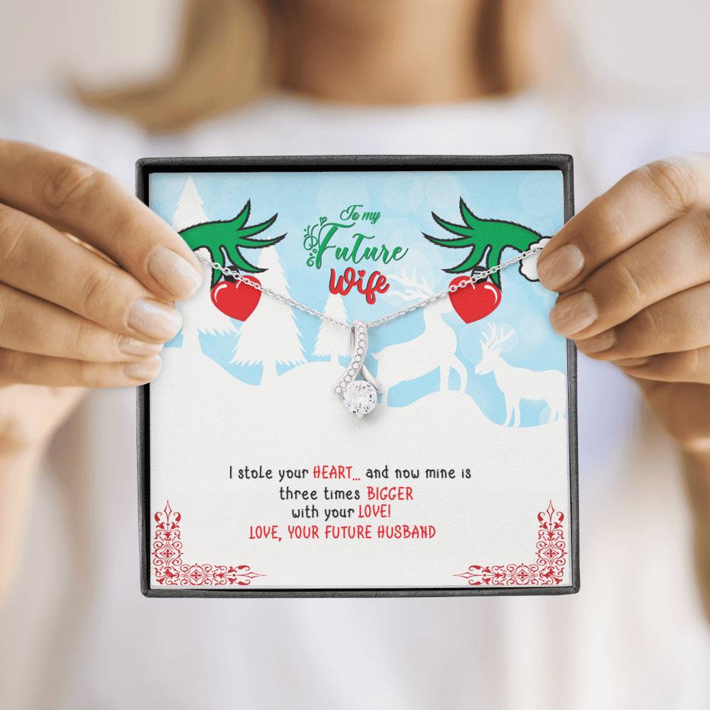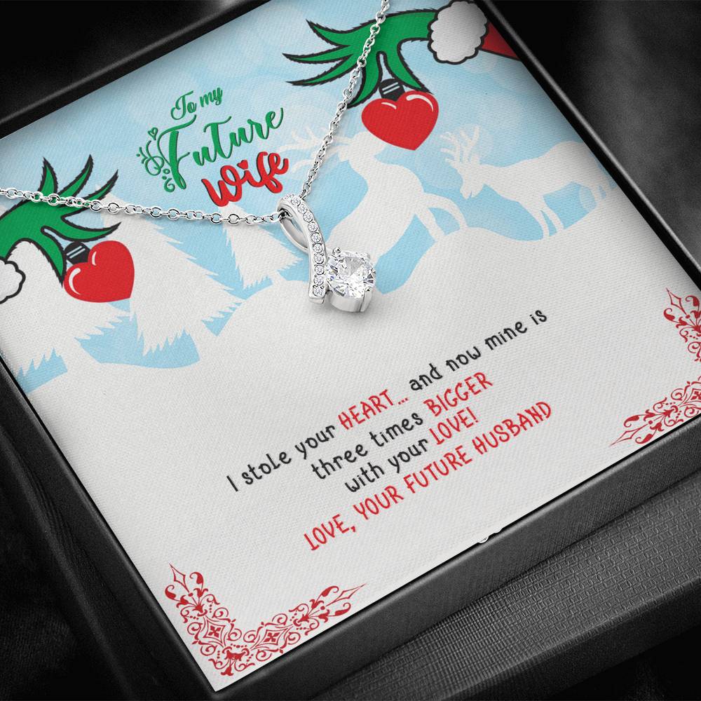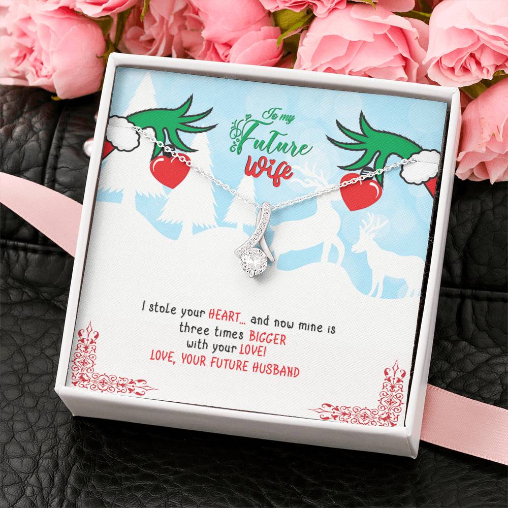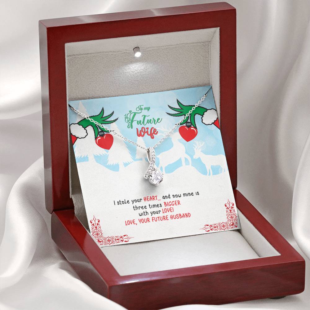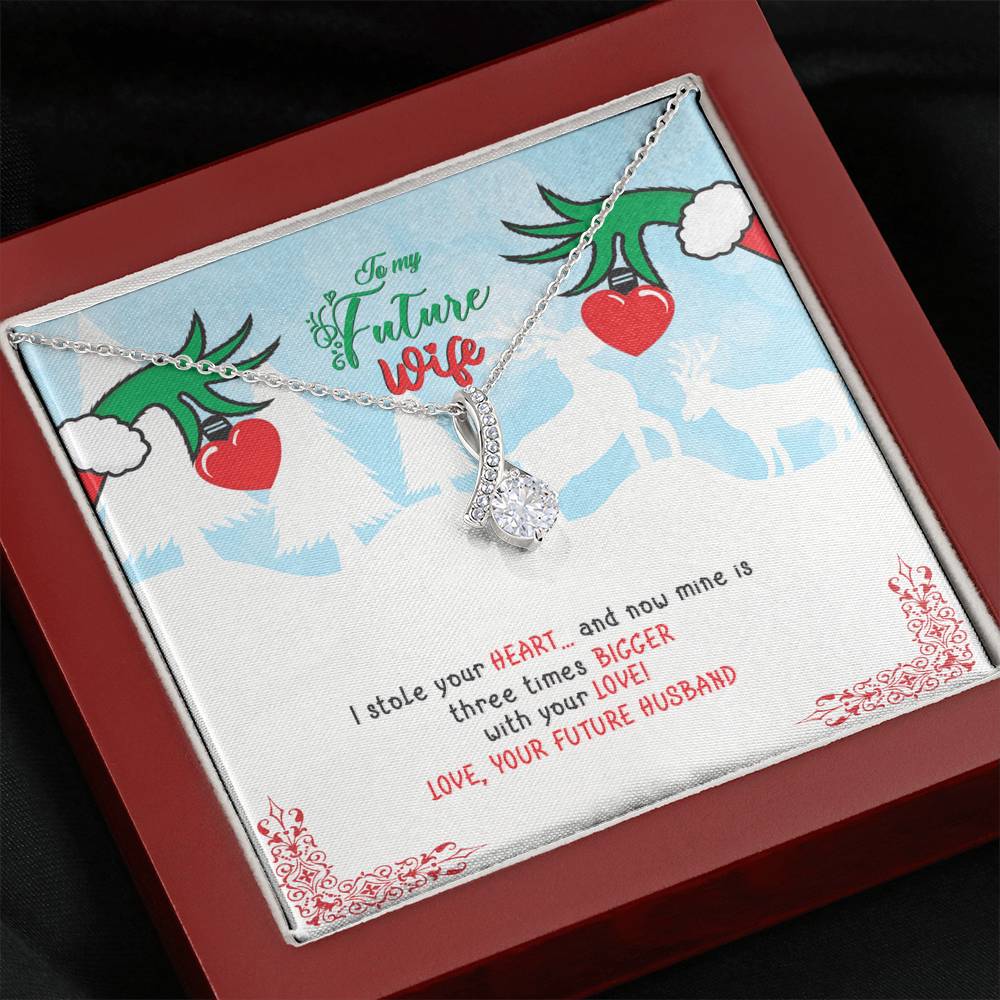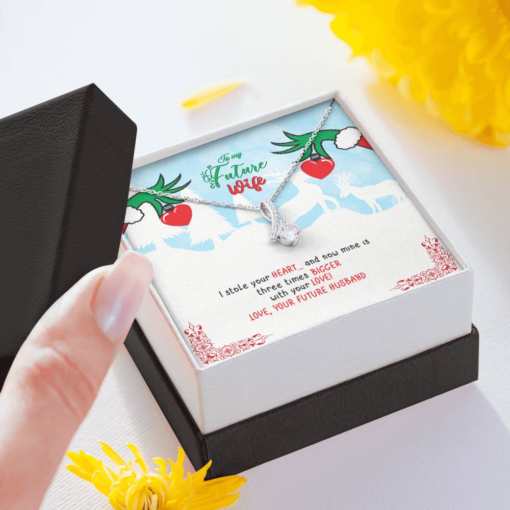 Melt her heart with this ALLURING BEAUTY necklace gift! The petite ribbon shaped pendant is finished with 14K white gold over stainless steel, and is embellished with dainty clear crystals surrounded by a sparkling 7mm round cut Cubic Zirconia.