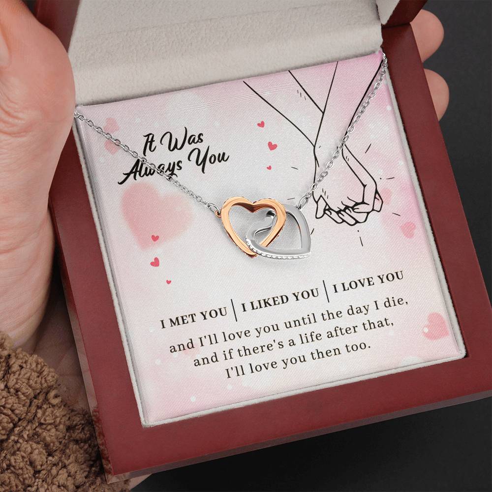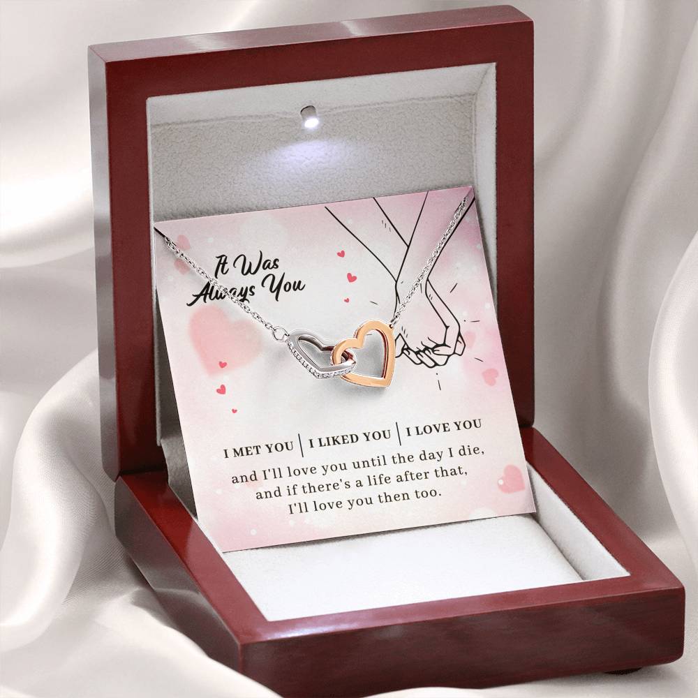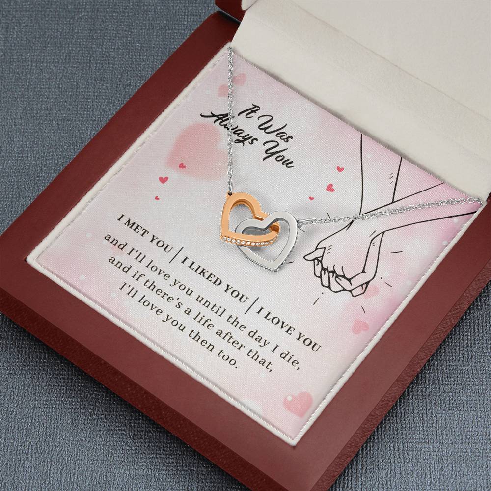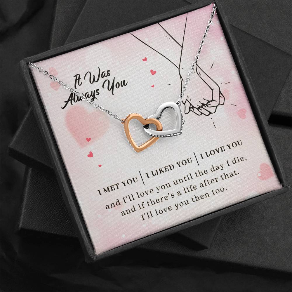 Two hearts embellished with Cubic Zirconia stones, interlocked together as a symbol of never-ending love. Made with high quality polished surgical steel. Cable chain measures 18 inches with a 4 inch extension, and fastens with a lobster clasp.