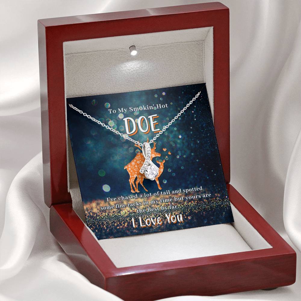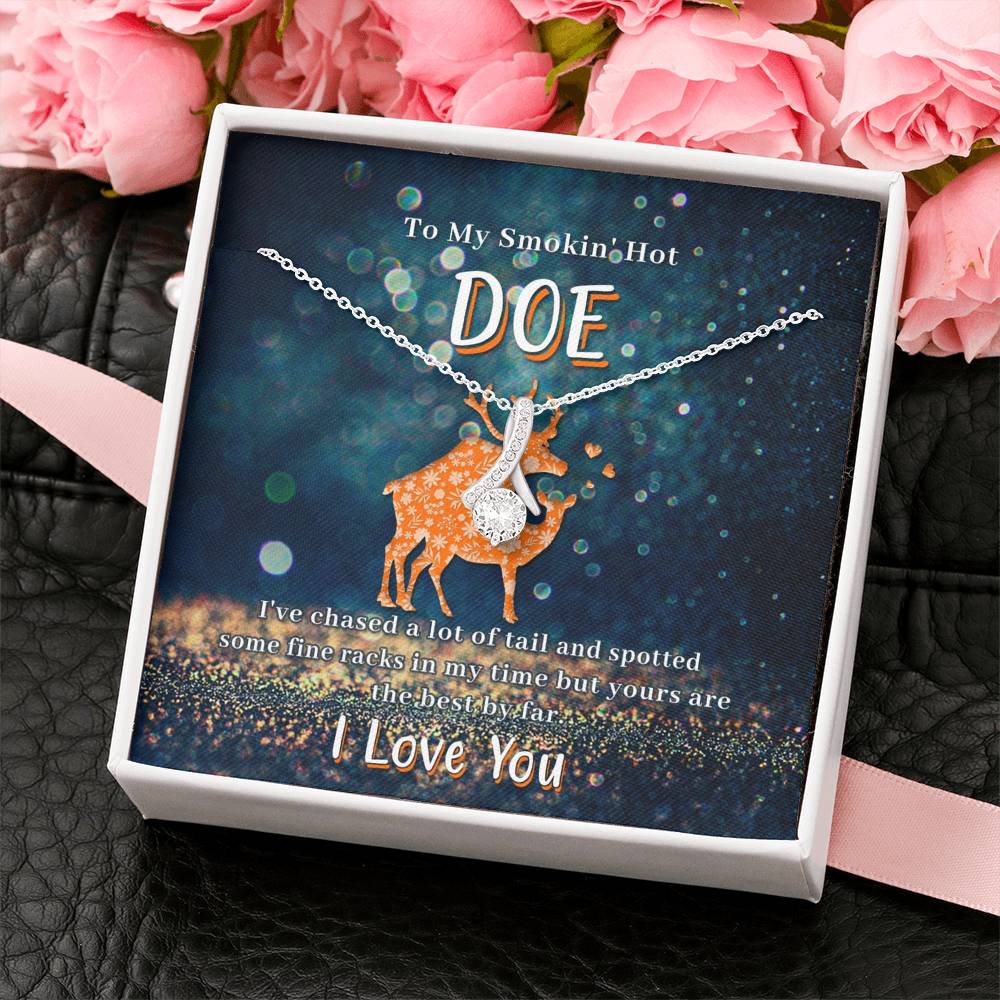 Melt her heart with this ALLURING BEAUTY necklace gift! The petite ribbon shaped pendant is finished with 14K white gold over stainless steel, and is embellished with dainty clear crystals surrounded by a sparkling 7mm round cut Cubic Zirconia.
