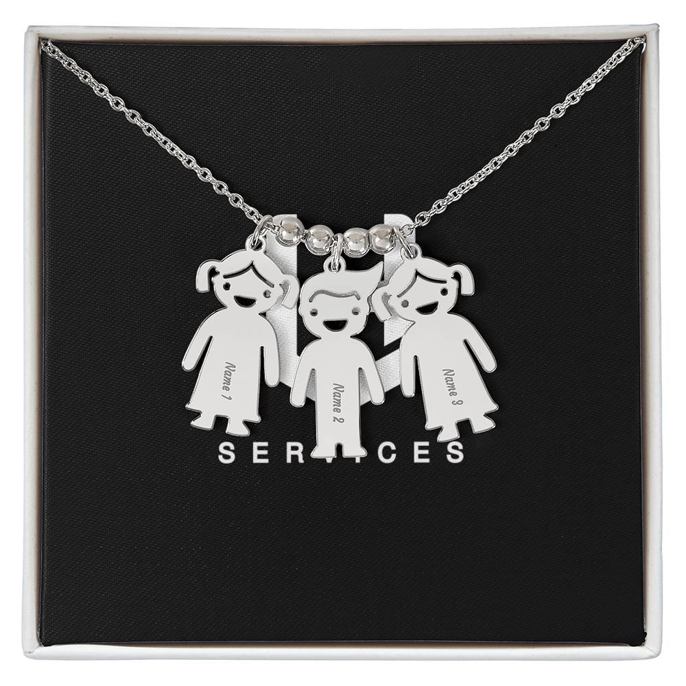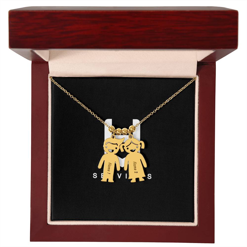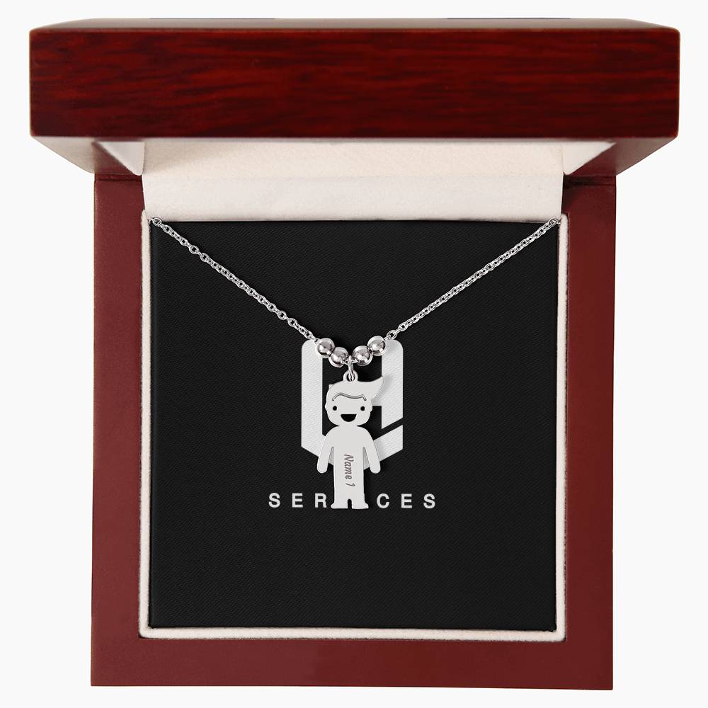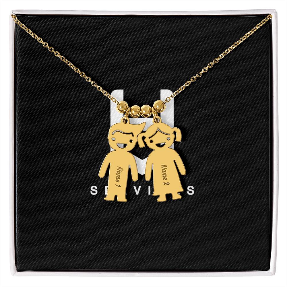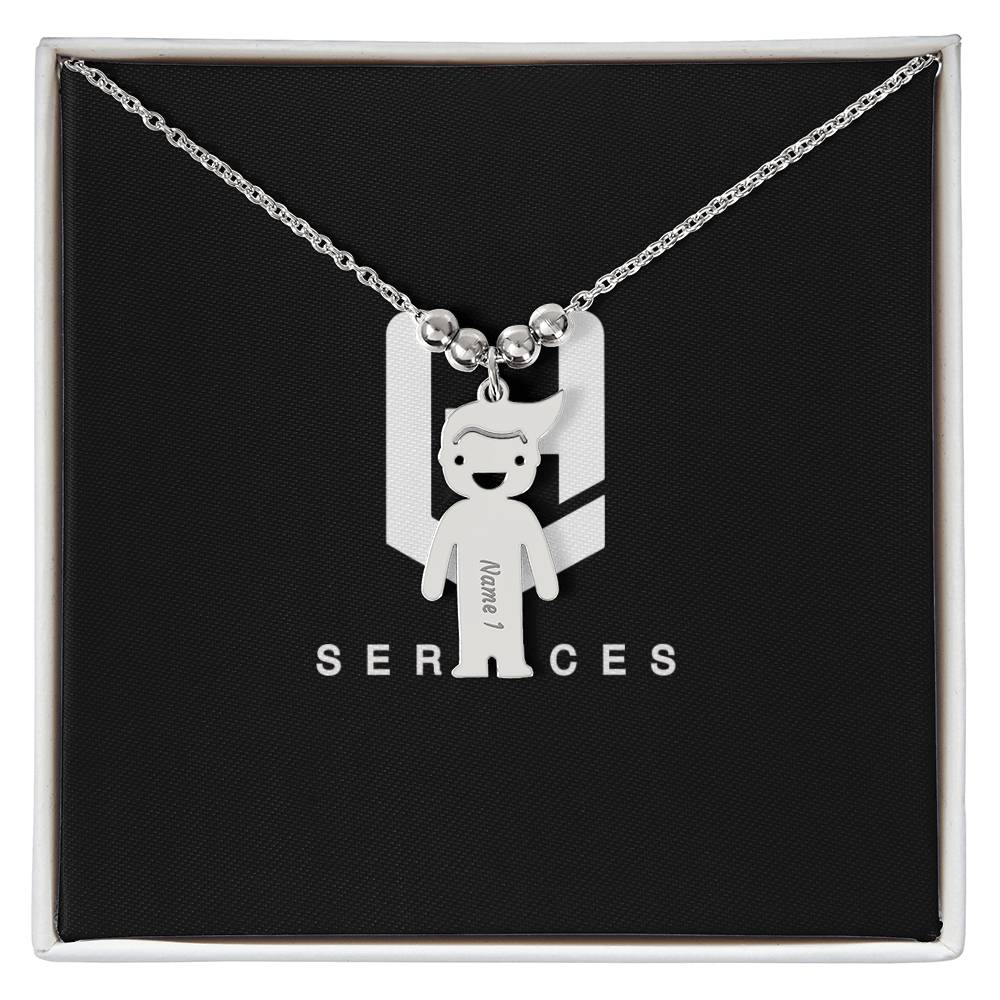 This unforgettable gift will leave her speechless! Introducing the Engraved Kids Charm Necklace. This necklace features up to three engraved charms, each shaped like a child, and can be personalized with the name or word of your choice. Made with high-quality materials, this necklace is a perfect gift for mothers and grandmothers who want to keep their children or grandchildren close to their heart. Whether you want to commemorate a special moment, celebrate a milestone, or simply express your love, this necklace is a perfect way to do it.