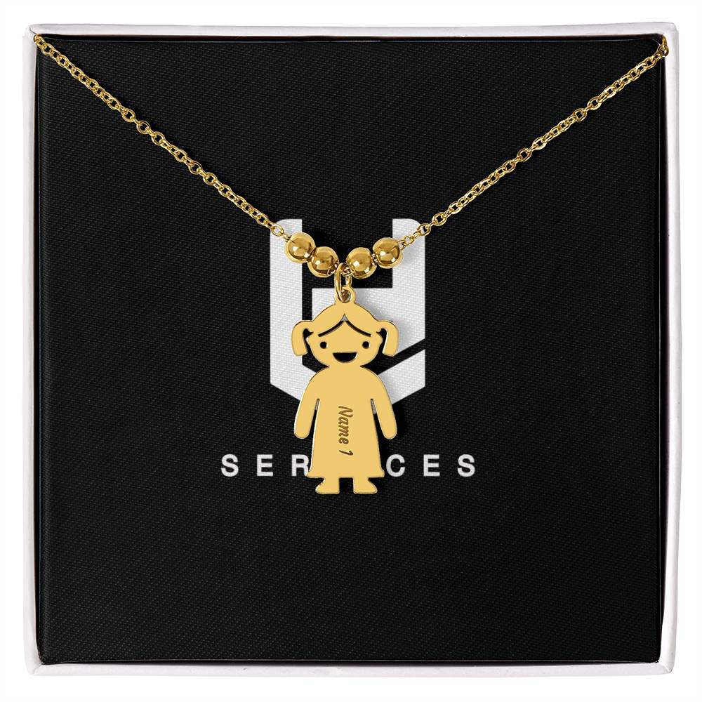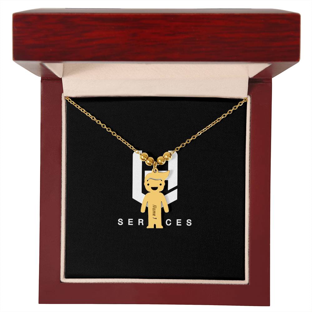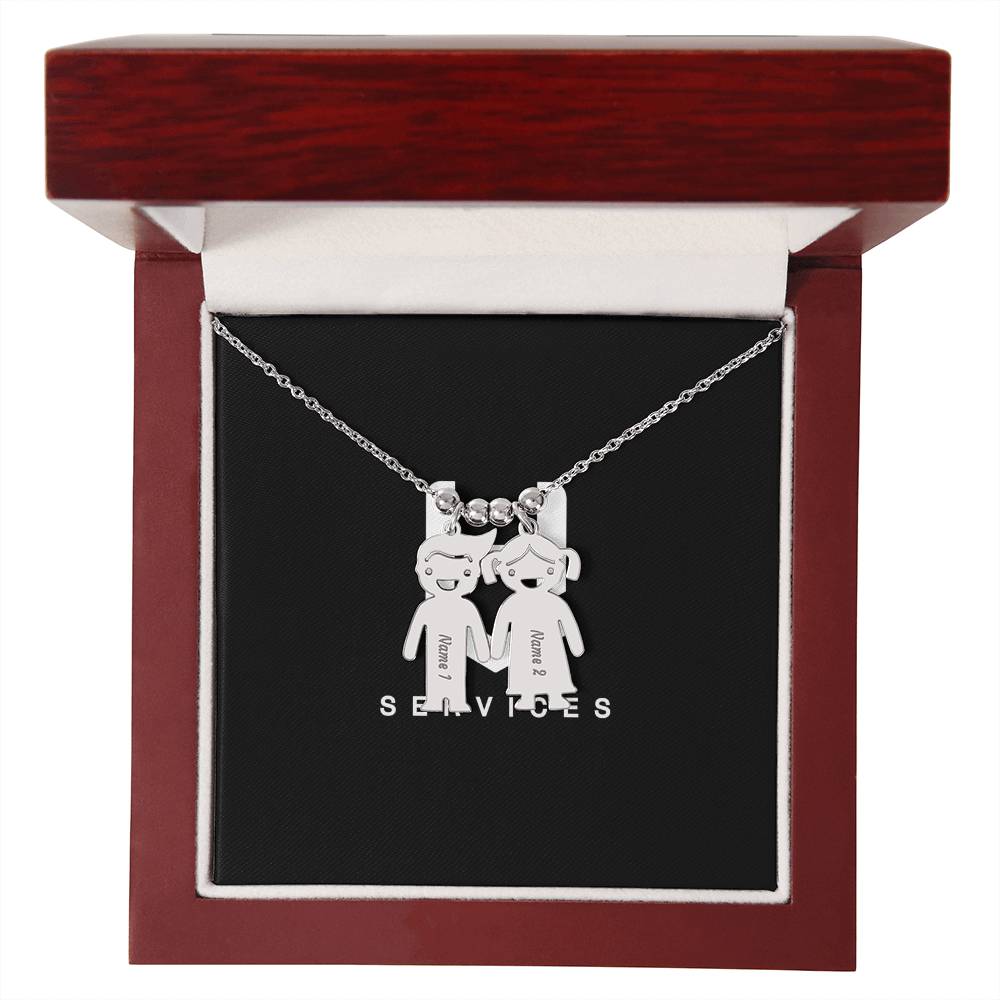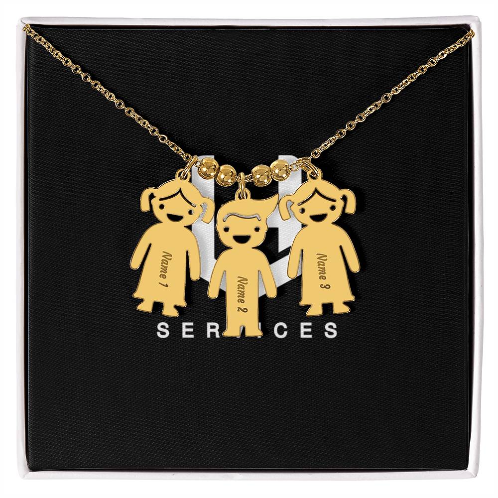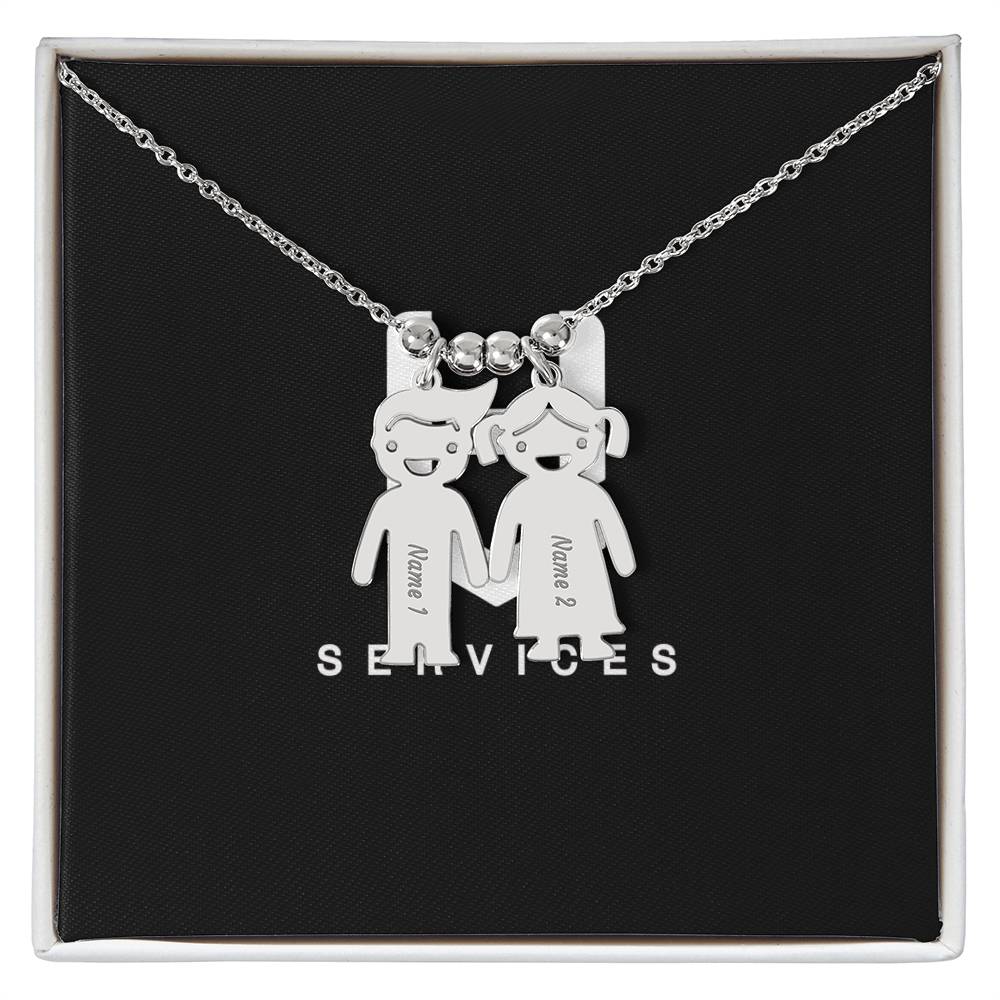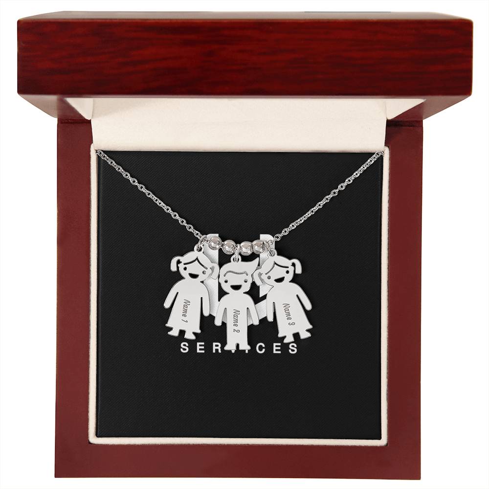 This unforgettable gift will leave her speechless! Introducing the Engraved Kids Charm Necklace. This necklace features up to three engraved charms, each shaped like a child, and can be personalized with the name or word of your choice. Made with high-quality materials, this necklace is a perfect gift for mothers and grandmothers who want to keep their children or grandchildren close to their heart. Whether you want to commemorate a special moment, celebrate a milestone, or simply express your love, this necklace is a perfect way to do it.
