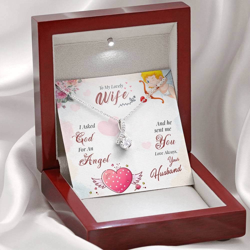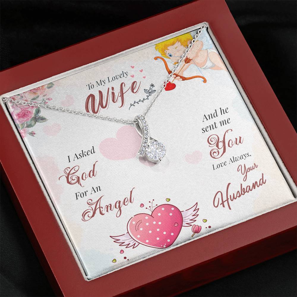 Melt her heart with this ALLURING BEAUTY necklace gift! The petite ribbon shaped pendant is finished with 14K white gold over stainless steel, and is embellished with dainty clear crystals surrounded by a sparkling 7mm round cut Cubic Zirconia.