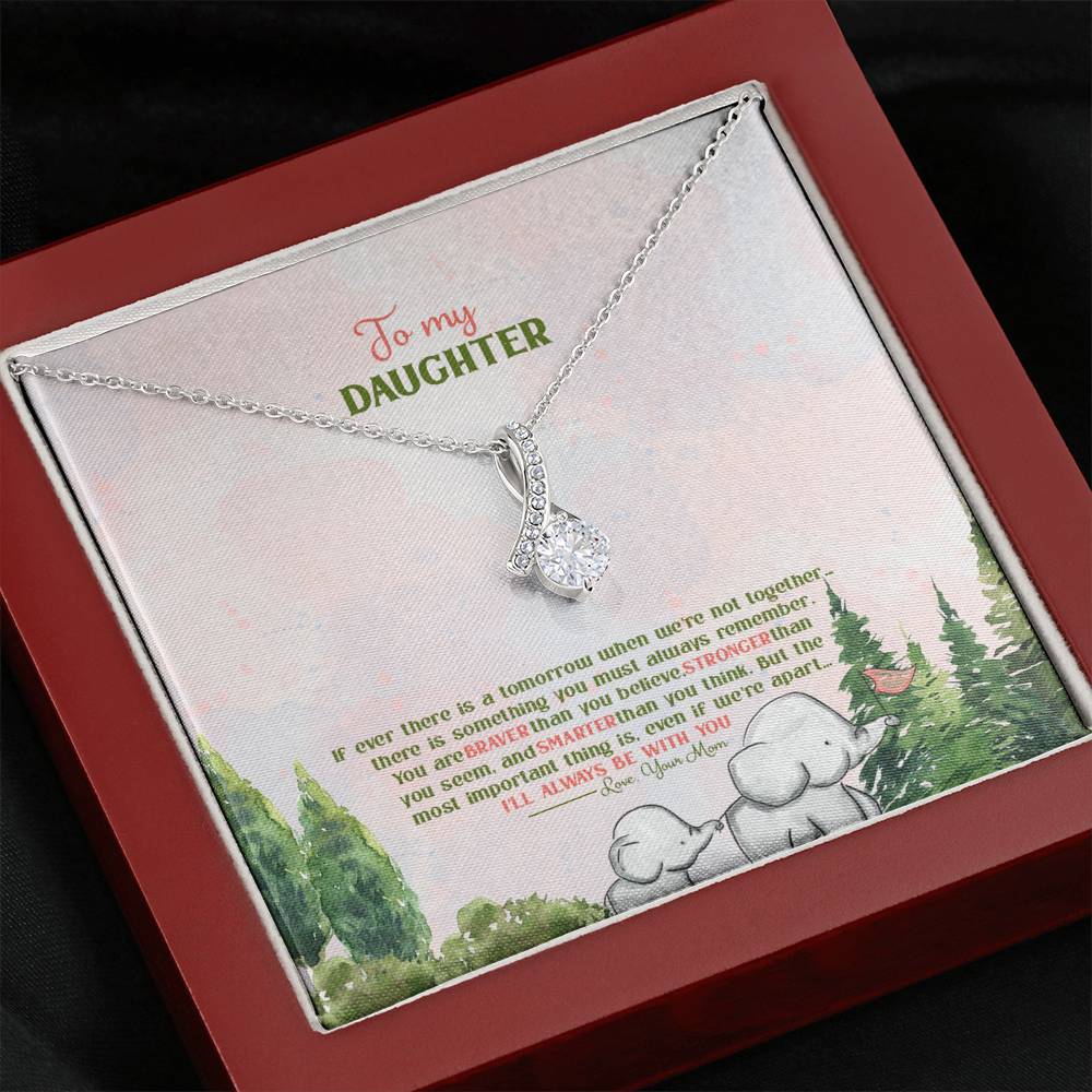 Melt her heart with this ALLURING BEAUTY necklace gift! The petite ribbon shaped pendant is finished with 14K white gold over stainless steel, and is embellished with dainty clear crystals surrounded by a sparkling 7mm round cut Cubic Zirconia.