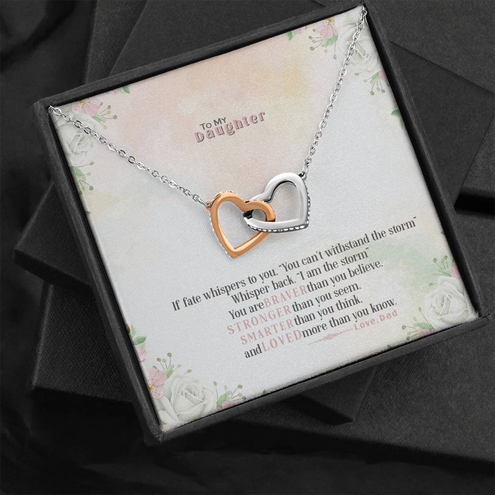 Two hearts embellished with Cubic Zirconia stones, interlocked together as a symbol of never-ending love. Made with high quality polished surgical steel. Cable chain measures 18 inches with a 4 inch extension, and fastens with a lobster clasp.