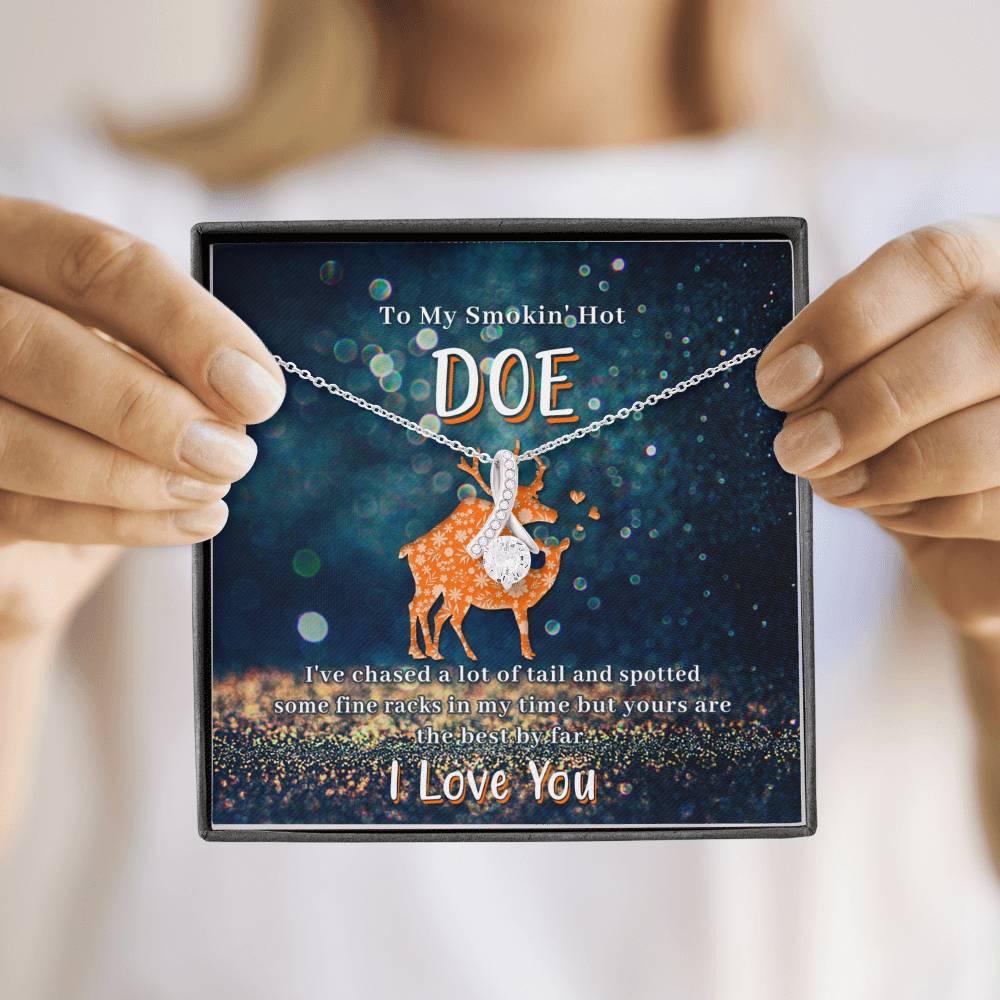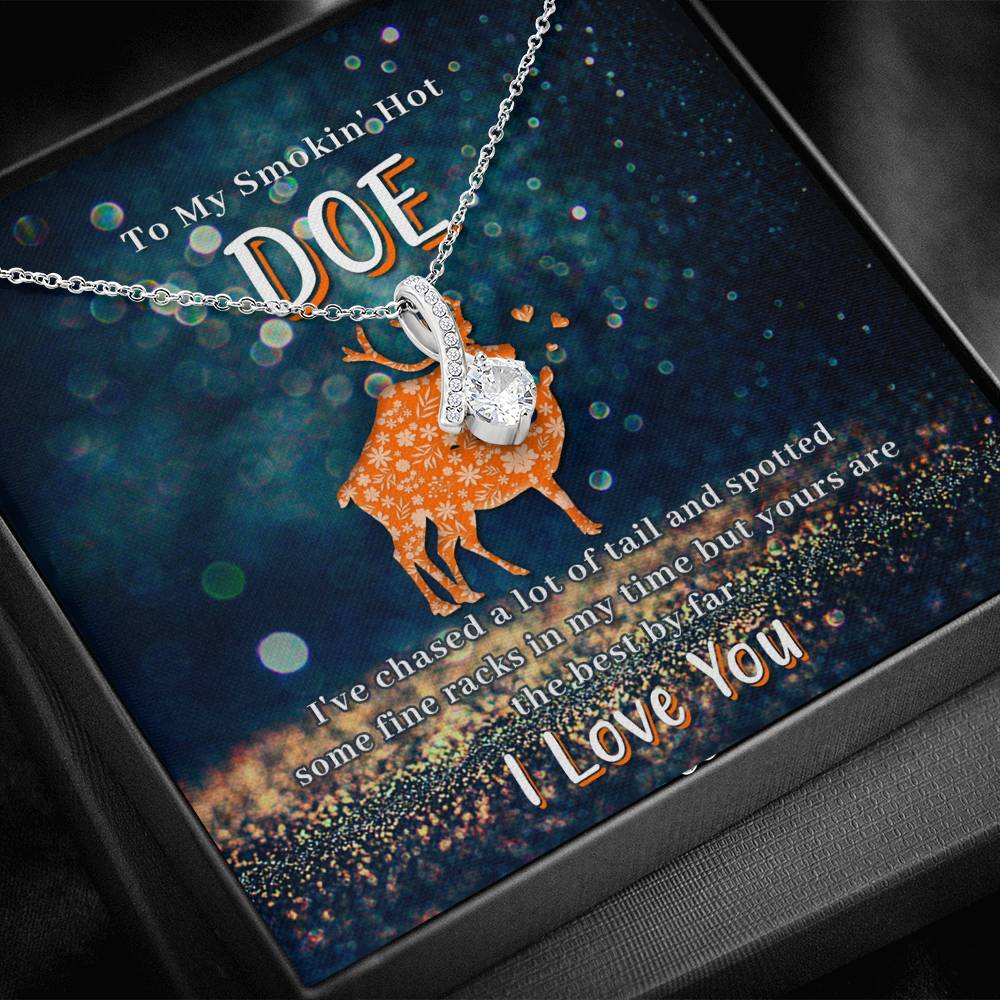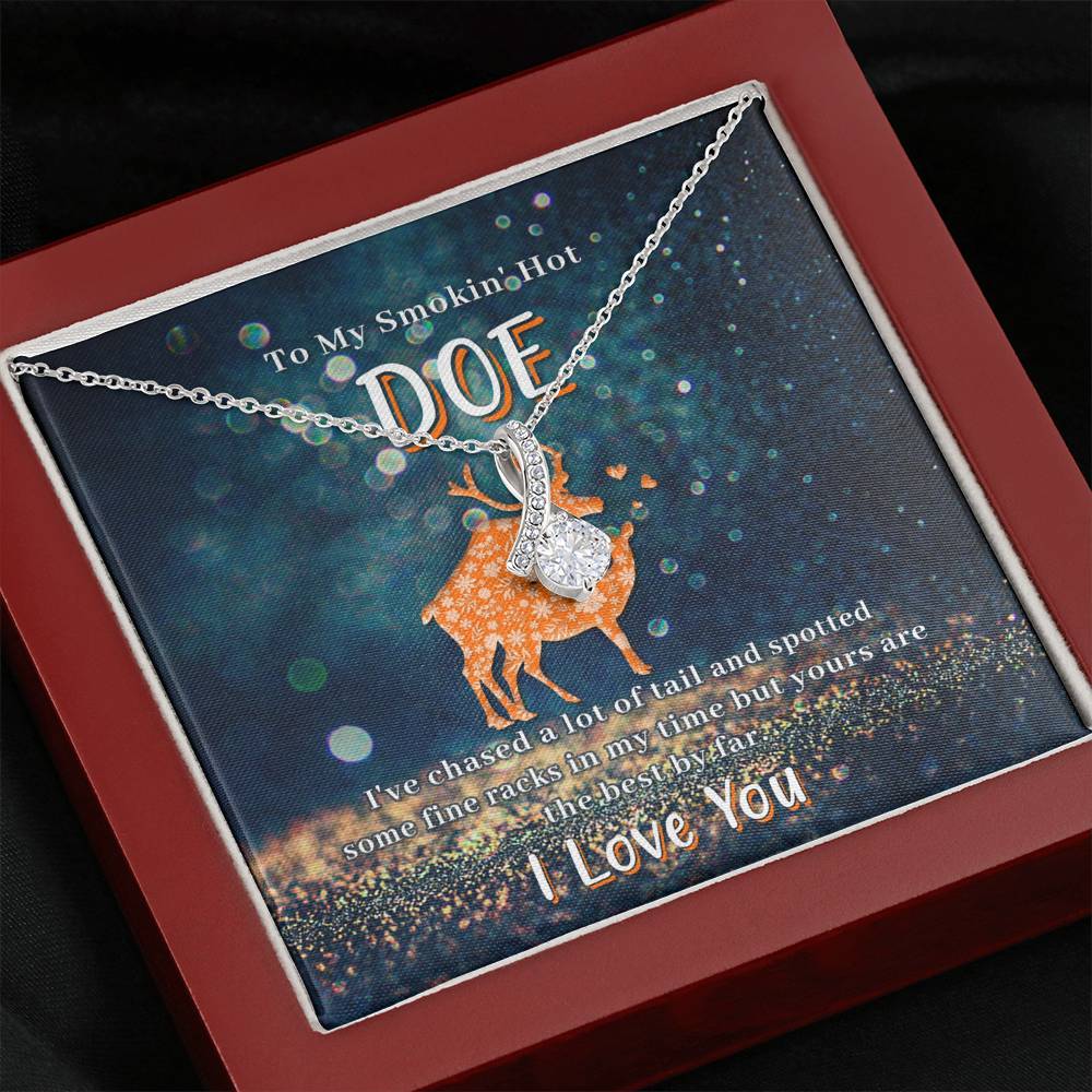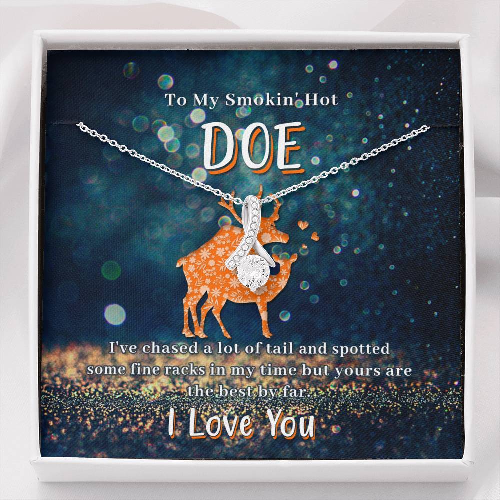 Melt her heart with this ALLURING BEAUTY necklace gift! The petite ribbon shaped pendant is finished with 14K white gold over stainless steel, and is embellished with dainty clear crystals surrounded by a sparkling 7mm round cut Cubic Zirconia.
